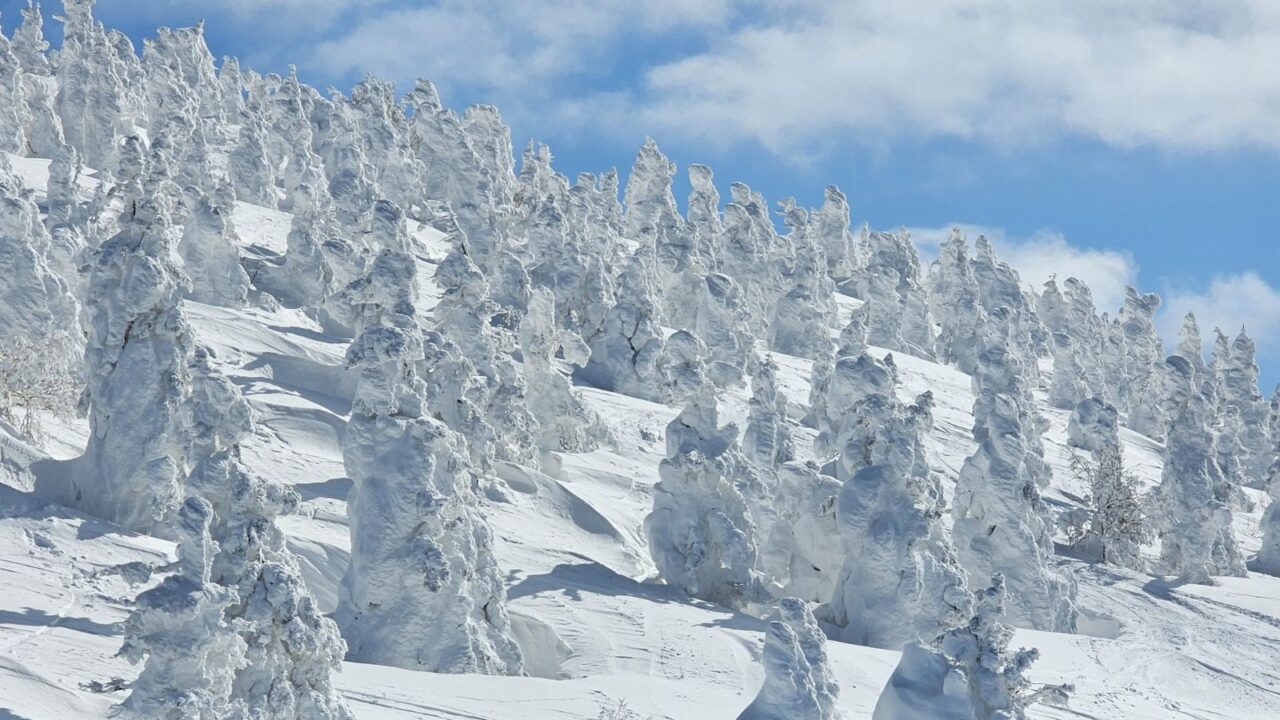 One of Aomori’s most unique sights is the “snow monsters,” or juhyō, trees completely buried and frozen into strange shapes. These formations occur when icy winds coat the trees with layers of frost and snow. The effect becomes strongest during mid-winter storms.