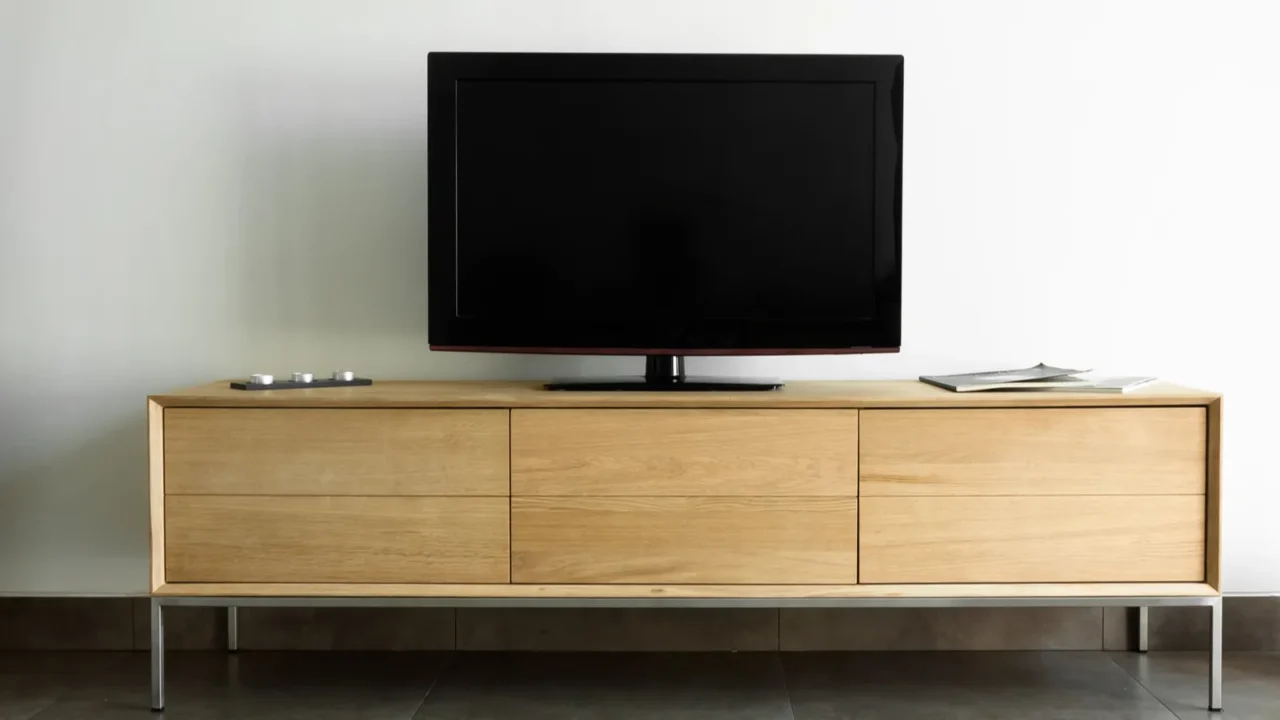 A TV on a wooden media console with storage drawers in front of a white wall.